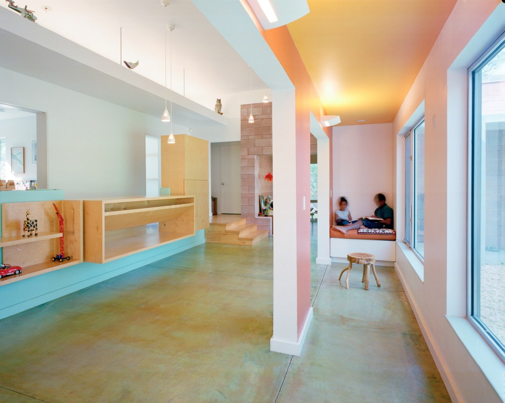 The original house was built in 1949 and was a modest two-bedroom frame structure on a generous site. The owners wanted to enlarge the house to accommodate the needs of the family. The site design strategy includes the reorientation of the main entry, construction of a masonry site wall along the north edge and creation of an exterior courtyard by the organization of the program into an “L” shape. Each program section is expressed materially. The rectangular masonry block of the studio becomes a site element and the new bedrooms and reading room, clad in corrugated metal, emerge from the block wall. The heart of the interior space is a large family activity hall on the lower level with private rooms for sleeping overlooking the space. The Great Hall is multilayered in plan and section. In the section, the site topography continues inside the large space and the Hall is itself a terraced landscape of interrelated private and public spaces.